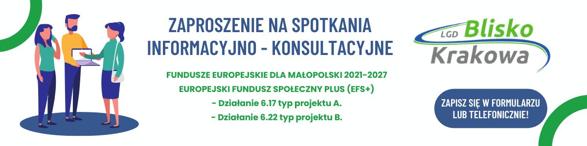 Zapraszamy na bezpłatne spotkania informacyjno-konsultacyjne dedykowane podmiotom zainteresowanym pozyskaniem dofinansowania projektów w ramach wdrażania LSR na lata 2023 – 2027 na obszarze LGD Blisko Krakowa.